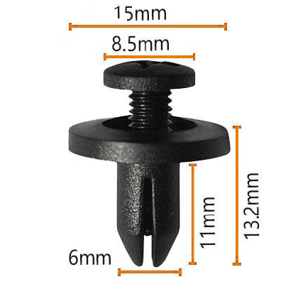 Šio tvirtinimo elemento galvos skersmuo yra 15 mm, bendras aukštis yra 13,2 mm, dugno plotis yra 8,5 mm, varžto ilgis yra 11 mln. M. Tinka vidinės plokštės, variklio skyrių dalims ir kėbulo apdaila.